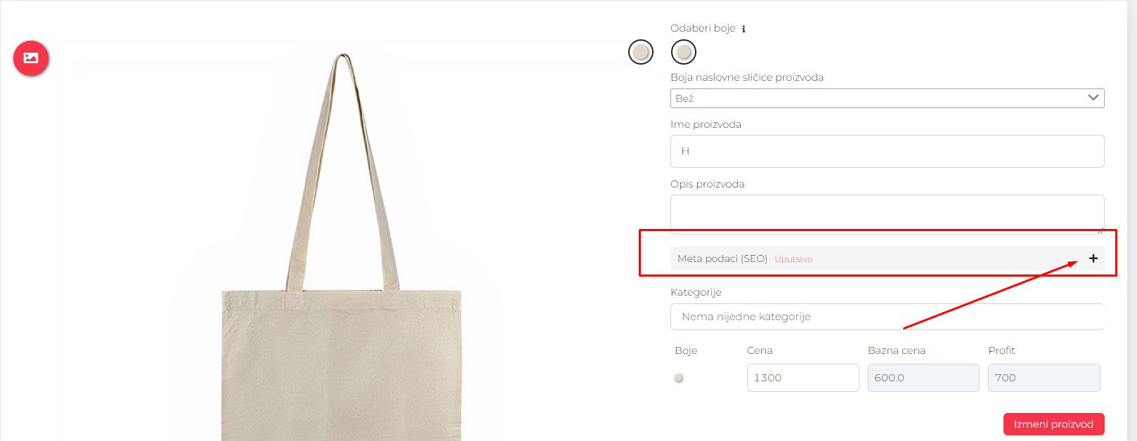Ove opcije se nalaze tik ispod naziva i opisa proizvoda. Klikni na plusić i otvorit će ti se dva polja za unost meta title-a i meta opisa: