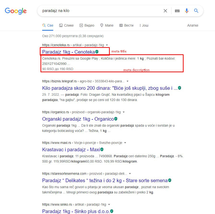 Svaki put kada izguglamo nešto, npr. “paradajz na kilo” izaći će nam neki rezultati pretrage. Svi rezultati pretrage poseduju 2 neophodna dijela – meta title i meta description koje možete vidjeti na slici ispod: