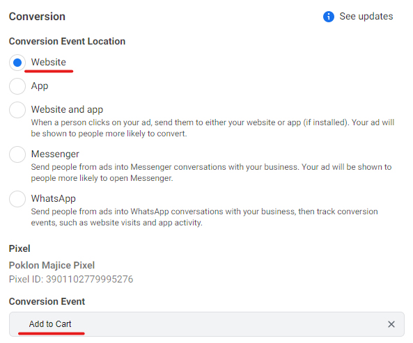 Razlika u podešavanju “Ad seta” je u tome što sada imamo “Conversion events“, gde stavljamo kao krajnji rezultat “Add to Cart“, odnosno dodavanje u korpu: