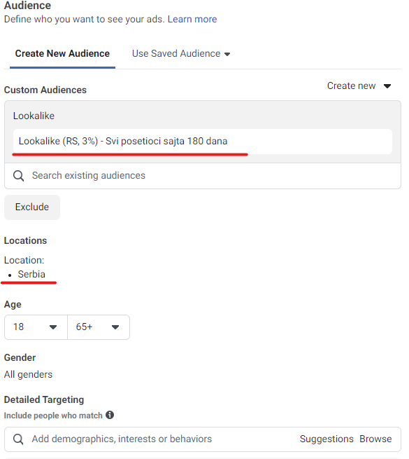 Naravno, ti možeš izabrati drugu Custom Publiku koju si kreirao/la, u skladu sa tim koga želiš da ciljaš. U ovom slučaju ne podešavaš broj godina, kao ni interesovanja koja ima tvoja publika. FB Pixel je izvukao dovoljno informacija o tome ko su ljudi koji su slični publici koja je posetila tvoju Brendly prodavnicu: