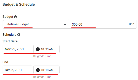 Nakon ovog koraka imamo podešavanje budžeta i vreme trajanja kampanje. Primer: