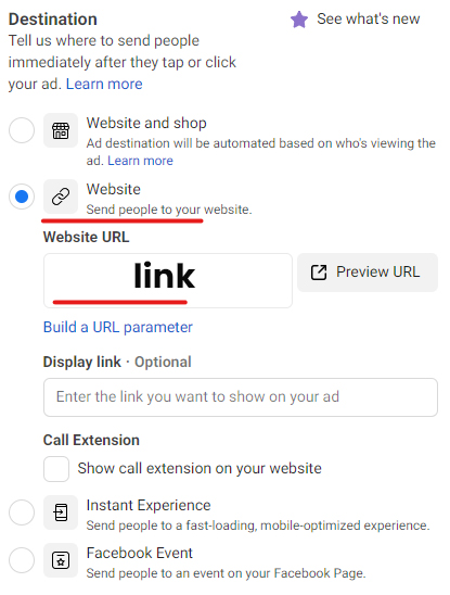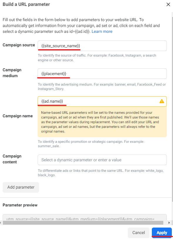 Nakon toga potrebno je proveriti da li je Pixel aktivan i kliknuti na Build a URL parametar. Selektuj opcije podvučene crvenom i klikni na Apply.