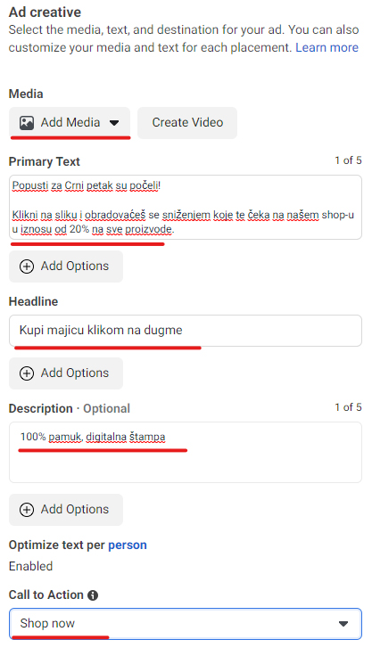 Kada dodaš kreirani sadržaj, unosi se “Primary Text, Headline, Desription i Call to Action” koji poziva na akciju i govori o pogodnostima koje su u ponudi za nedelju Crnog petka. Primer: